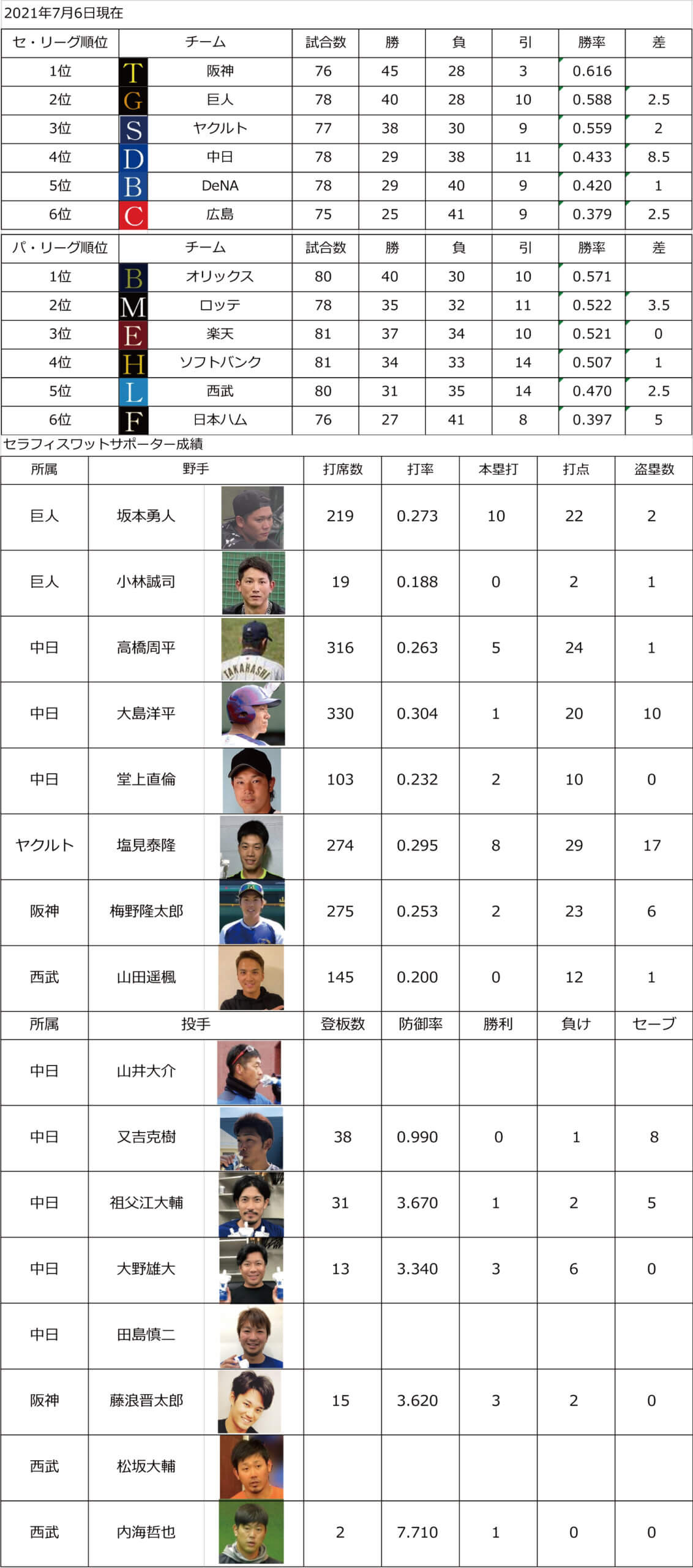 プロ野球2021 各リーグ順位&サポーター中間成績7月6日