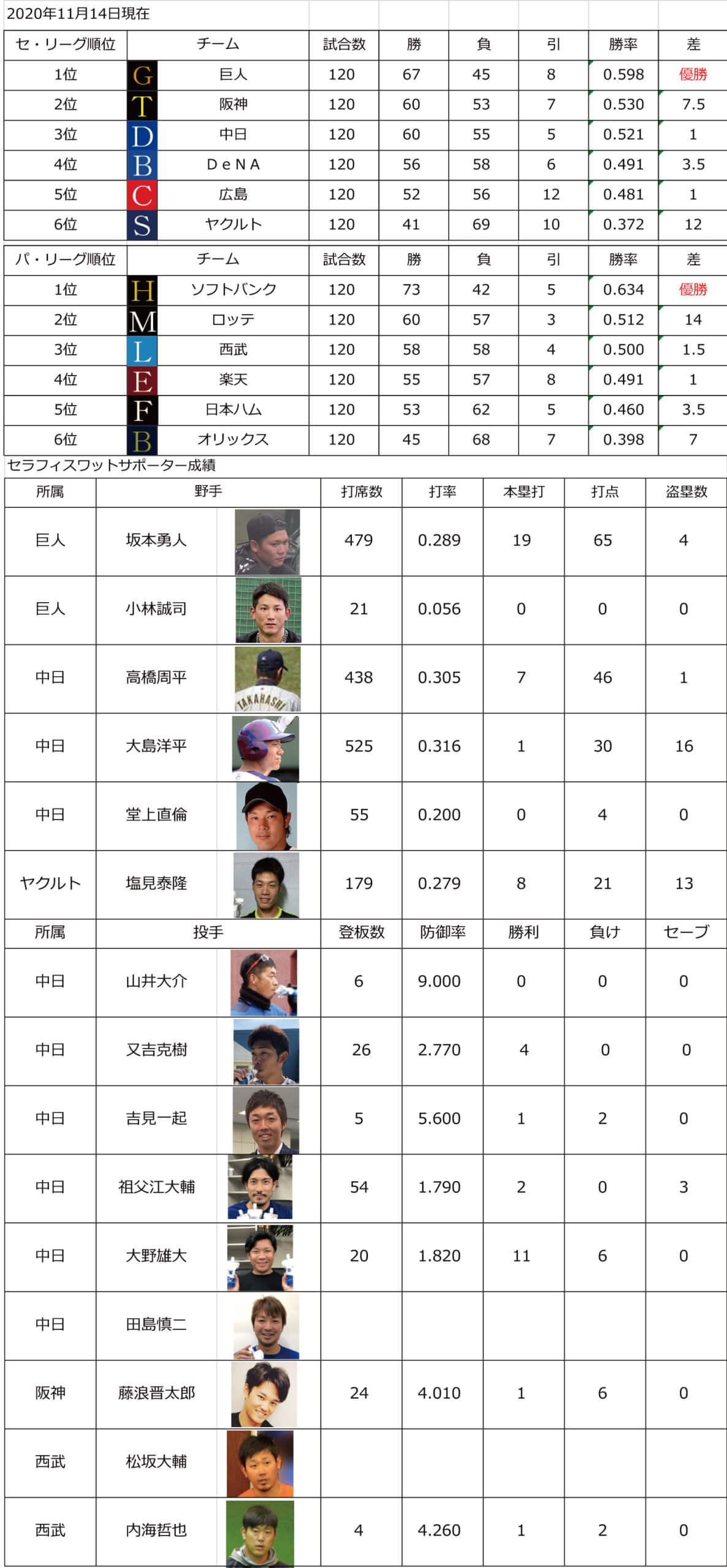 プロ野球各リーグ、及び、セラフィスワットサポーター各位の成績です。