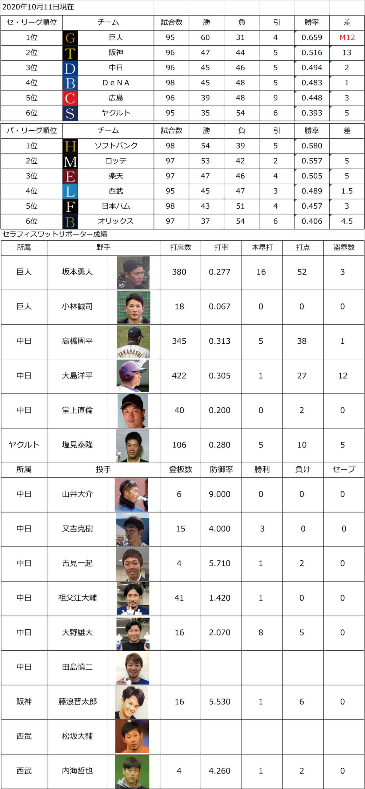 プロ野球各リーグ、及び、セラフィスワットサポーター各位の中間成績です。