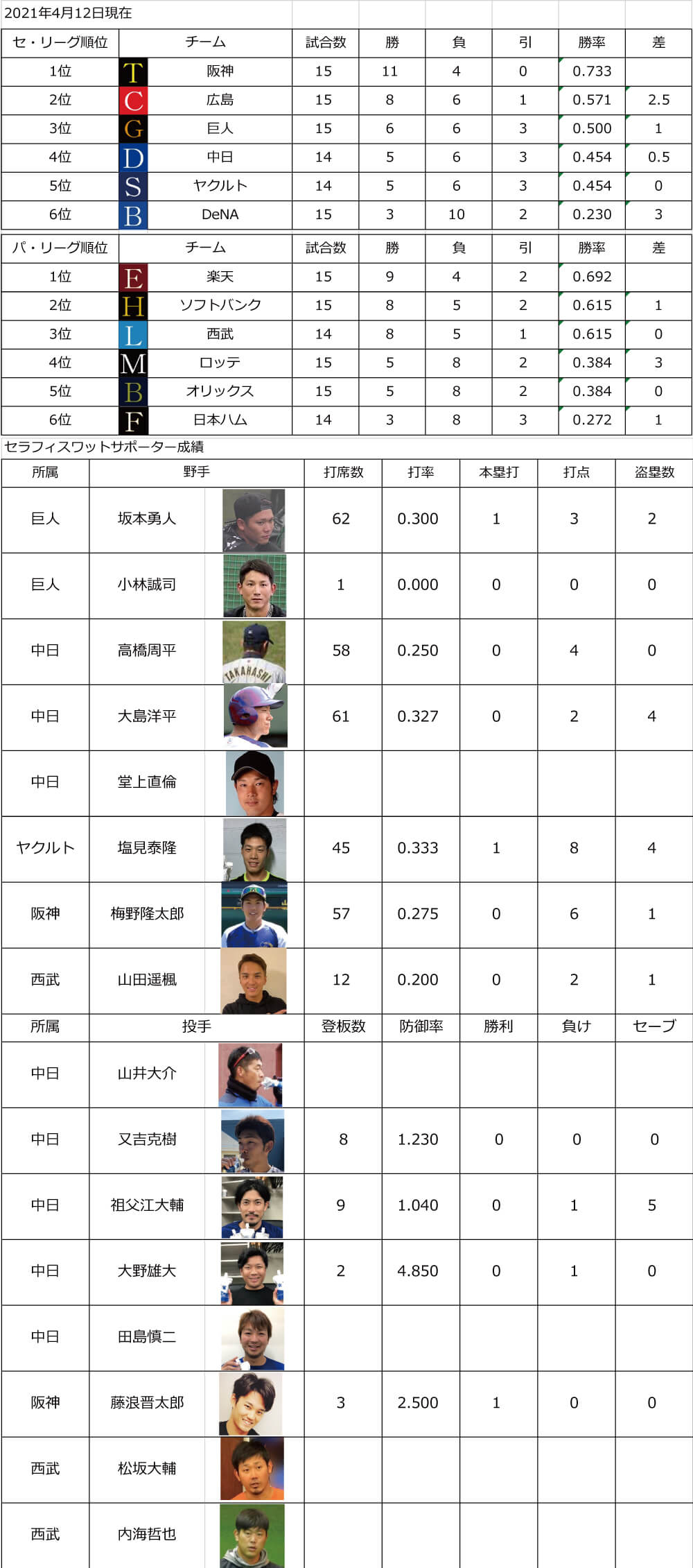 今年もプロ野球選手のセラフィスワットサポーター各位の状況をお伝えします。